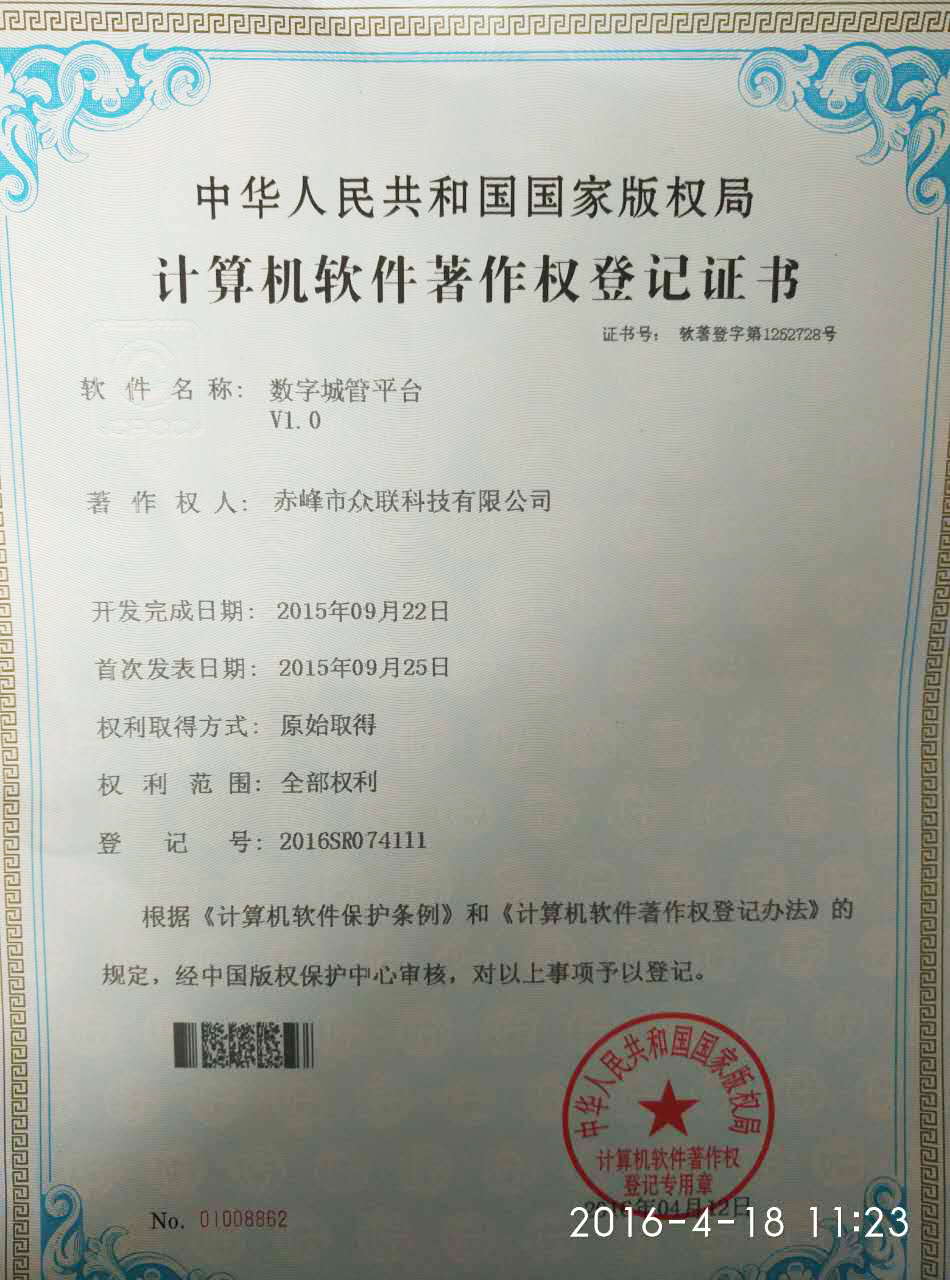 恭賀赤峰市眾聯(lián)科技有限公司通過大家的齊心協(xié)作,取得了“數(shù)字城管平臺”的軟件著作權!