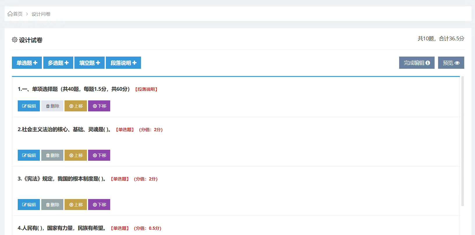 簡易性:支持批量導入各種類型文件題庫,支持固定試卷、抽題試卷和隨機試卷,自動生成統計報表。